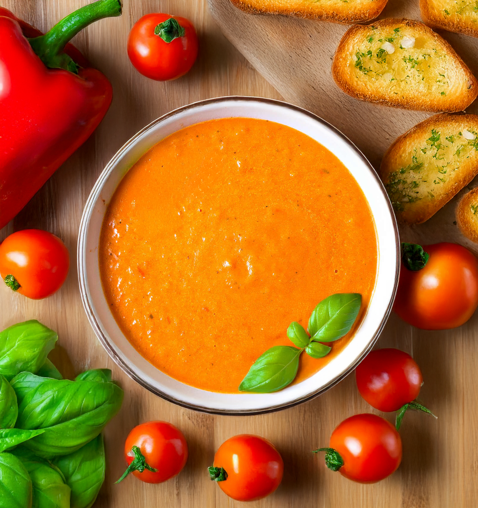 Vegetable Stock, Heavy Cream, Tomato Paste, Red Bell Pepper, Onions, Butter, EVOO, Basil, Salt, Pepper, Spices